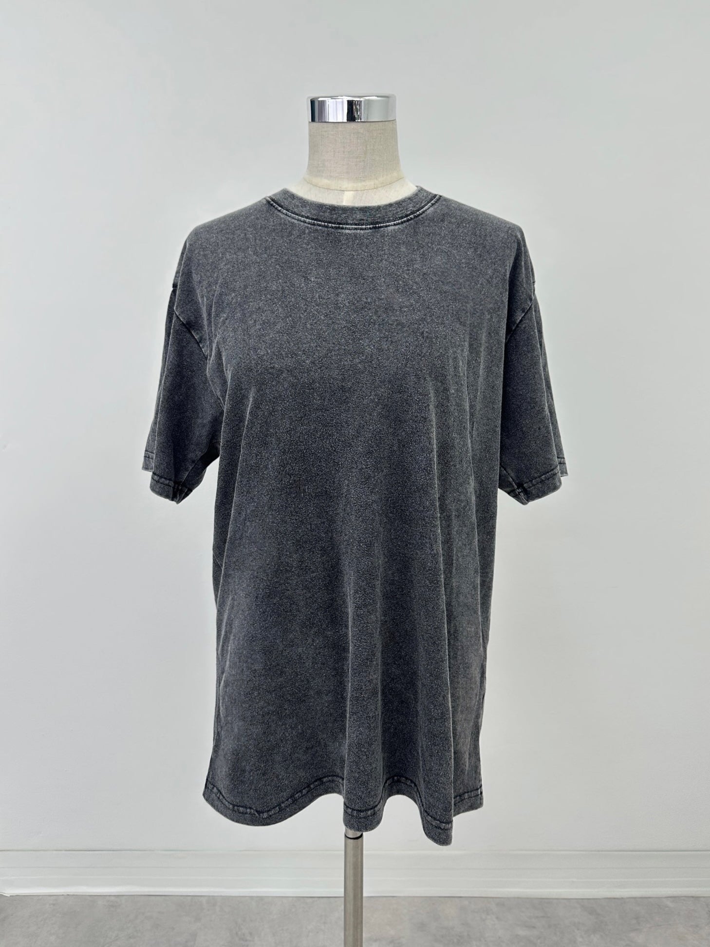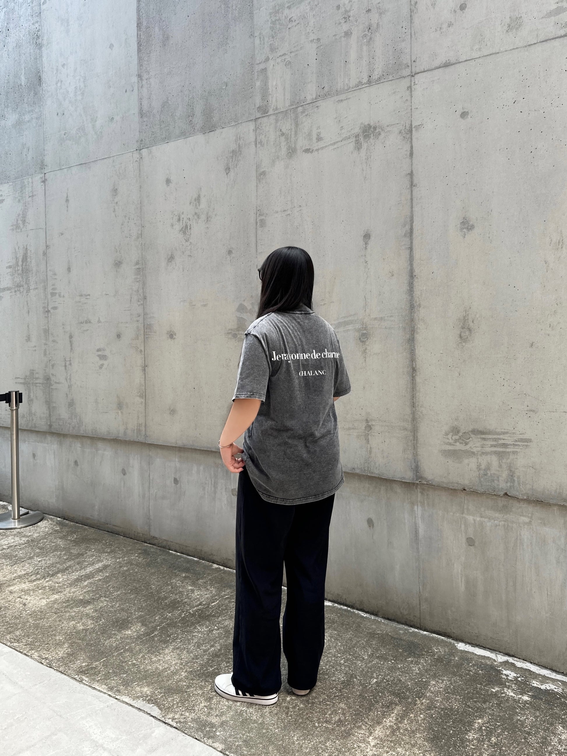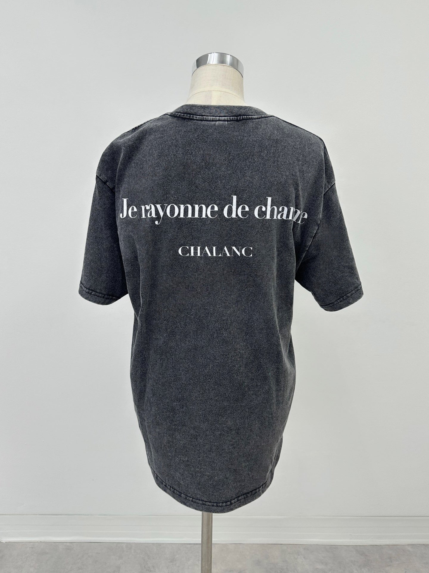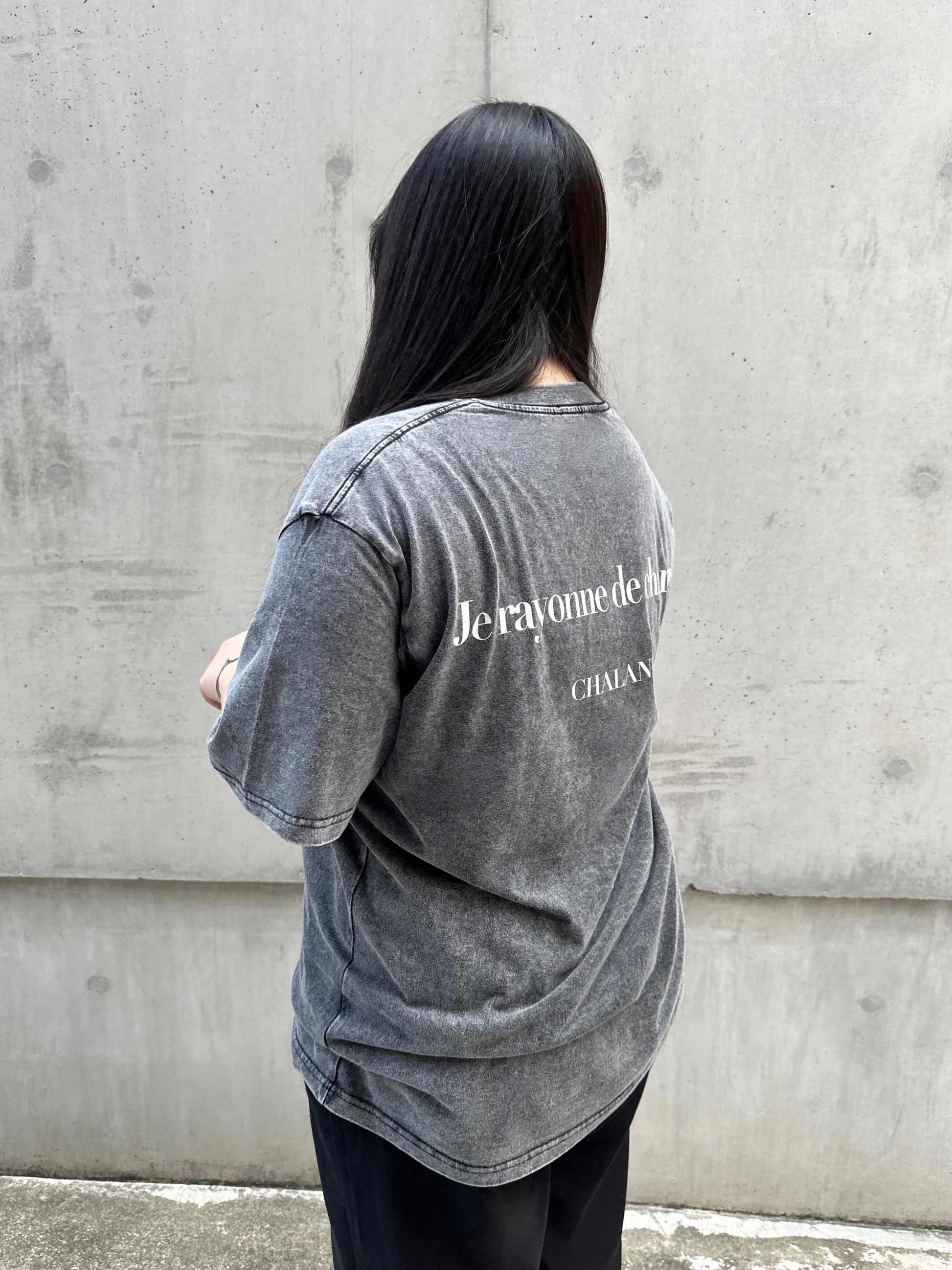 ヴィンテージ加工のTシャツに、ブランドを象徴するロゴ「Je rayonne de charme」をバックプリントしたオリジナルトップス